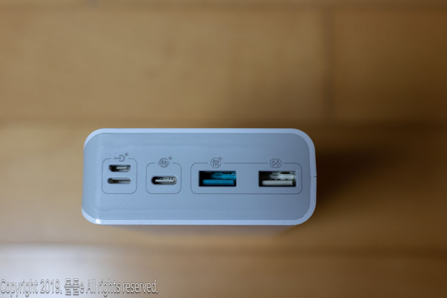 좌측부터 micro usb포트, 라이트닝 포트, usb 퀵차지 충전포트, 일반 usb 충전포트, usb type-c 포트 총 5개의 연결포트를 제공하고 있고, usb pd 충전기능을 지원하기 때문에, 애플 맥북, 맥북프로, 삼성 always9, 삼성 pen S, 아이패드, 서피스 고, 갤럭시 탭 그리고 닌텐도 스위치 등 pd충전기능을 지원하는 노트북과 게임기까지 충전이 가능합니다.