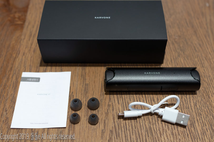 개개인의 귀 사이즈에 맞게 사용할 수 있는 이어캡, micro 5핀 충전 케이블, 설명서, 무선이어폰으로 구성되어 있습니다.