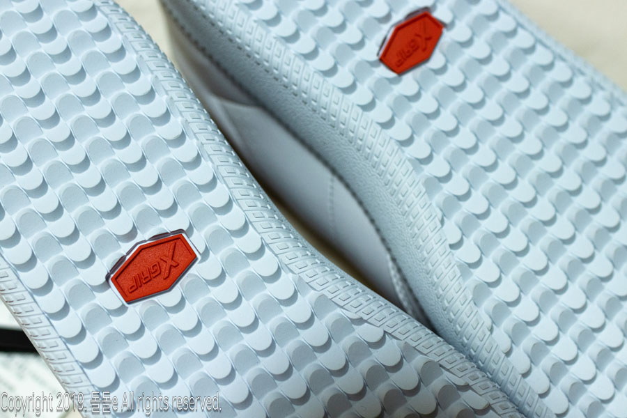 운동화 착용 전 밑바닥을 확인했으며 최상의 접지력과 그립력을 제공하는 아웃솔 기술이 적용된 케이투의 엑스그립 타입의 고무창이며, 논슬립 기능이 추가되어 미끄러움을 최소화한 운동화 바닥입니다.