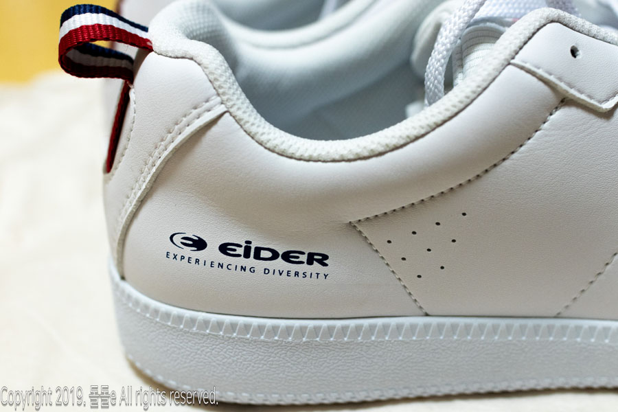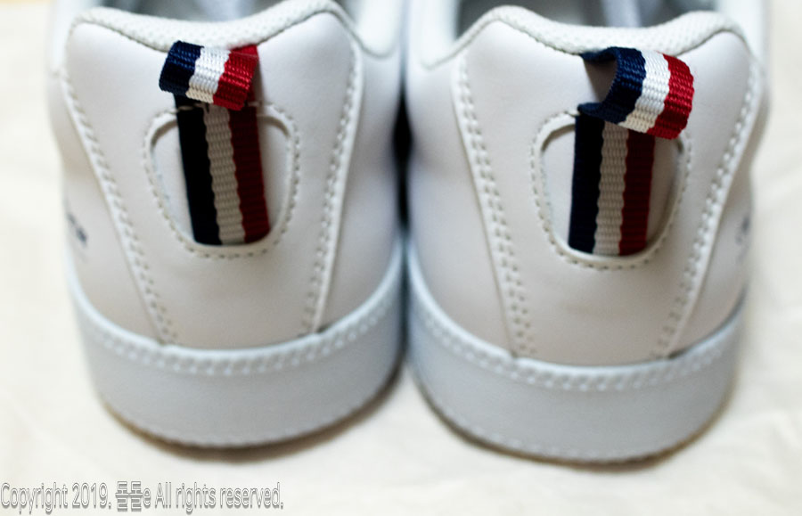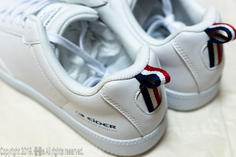 운동화에는 타공 스타일과 아이더 로고로 밋밋함을 없앴고, 운동화 뒤에는 프랑스 국기를 연상시키는 것을 부착해 한번 더 밋밋함을 없애 반바지, 7부 바지, 9부 바지 등을 입어도 예쁠 것 같습니다.