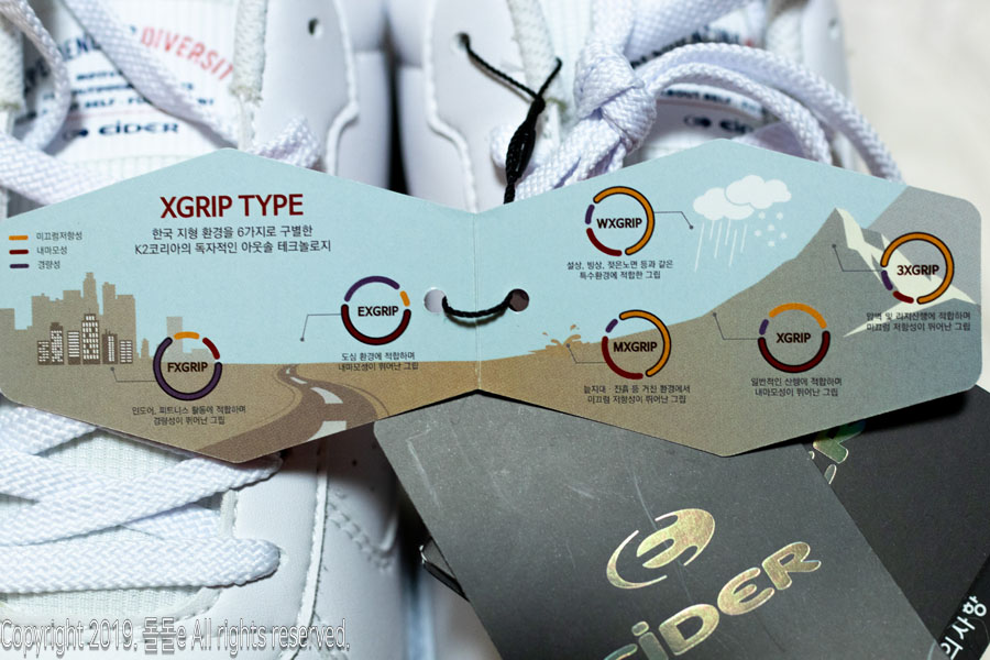 발이 편한 아이더 운동화 샤토루에는 K2코리아가 개발한 고무창으로 한국 지형 환경을 6가지로 구별한 k2의 독자적인 아웃솔 기술 XGRIP TYPE(엑스그릴 타입)이 적용되어 더욱 편안한 신발을 느낄 수 있다고 합니다.