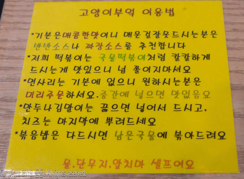 즉석떡볶이전문점 고양이부엌의 기본 맛은 매콤한맛이며, 매운걸 잘 못드시는 분은 반반소스 혹은 짜장소스를 추천드리며, 라면사리 등의 면사리는 기본 메뉴에는 없으니 원하시는 분은 주문과 동시에 하시는 것을 권장한다고합니다.
