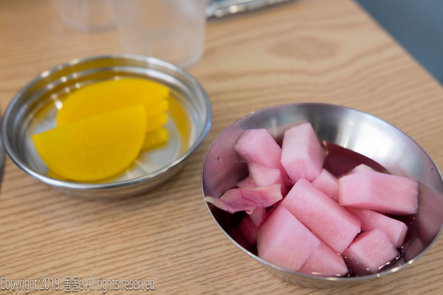 떡볶이와 함께 먹을 반찬은 단무지와 무 피클 2종이 나오며, 부족할 경우 셀프로 가져다 먹으면 됩니다.