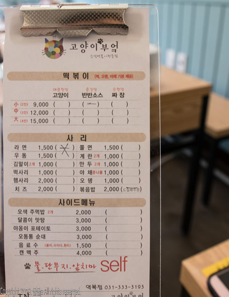 용인 명지대 근처에 있는 역북동 떡볶이를 맛있게 먹을 수 있는 고양이부엌 메뉴 가격입니다.