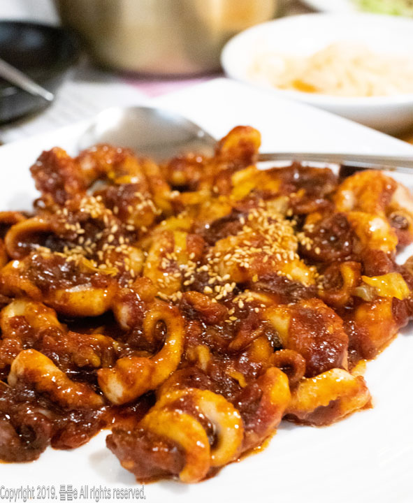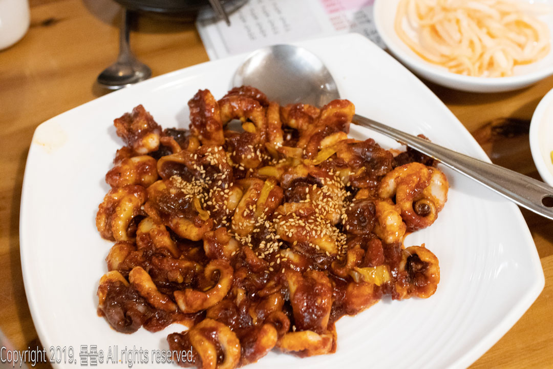 탱글한 주꾸미에 깨소금이 뿌려져 먹음직스러운 시흥맛집 물왕리 참소예의 쭈꾸미볶음입니다.