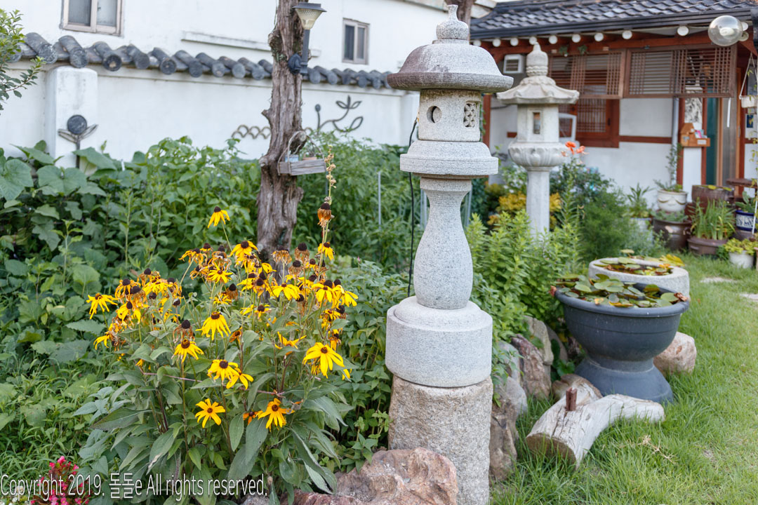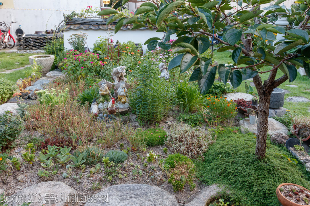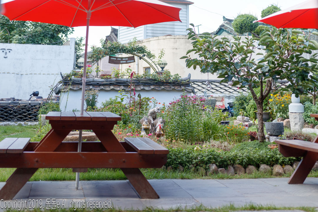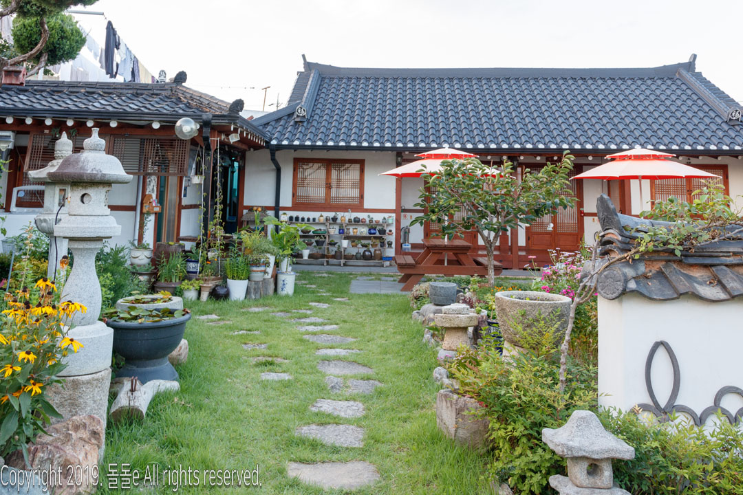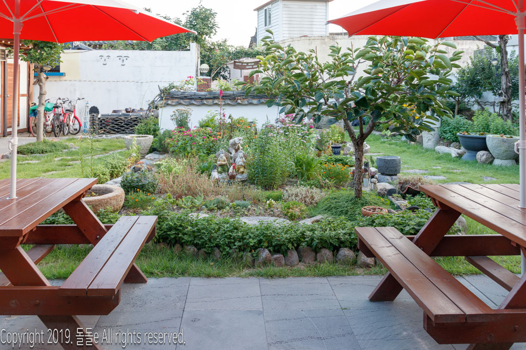 경주한옥민박 라온의 자랑거리 바로 마당에 있는 정원입니다. 정원에는 여러 동상이 설치되어 있고, 각종 다육이 등의 식물이 있어 방안에 가만히 앉아 정원만 봐도 힐링되는 느낌을 받을 수 있는 경주 한옥 게스트하우스입니다