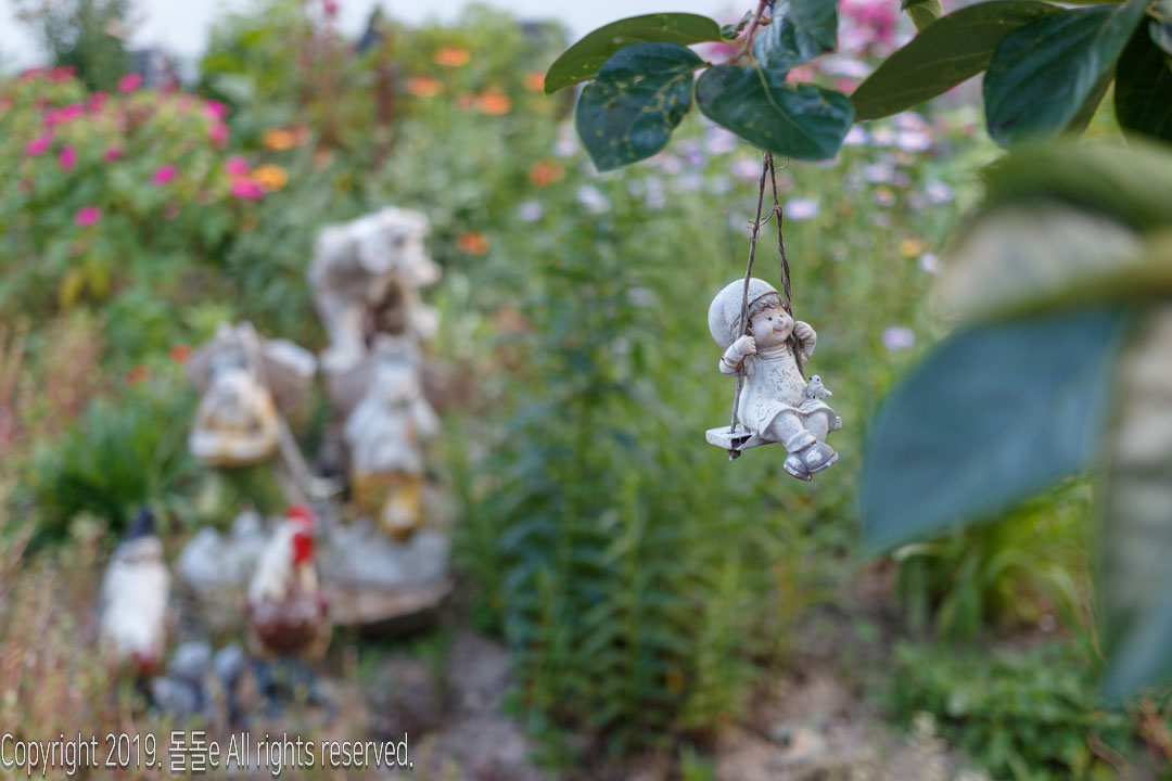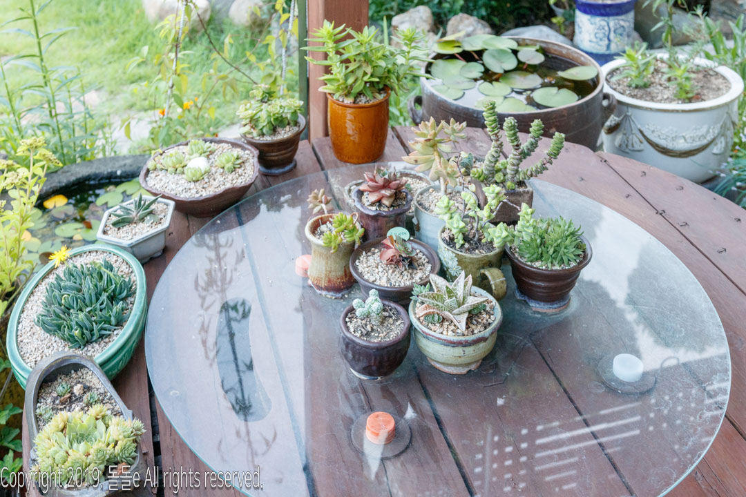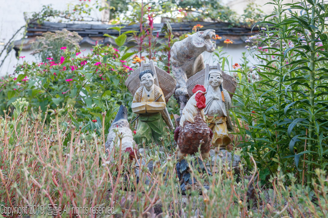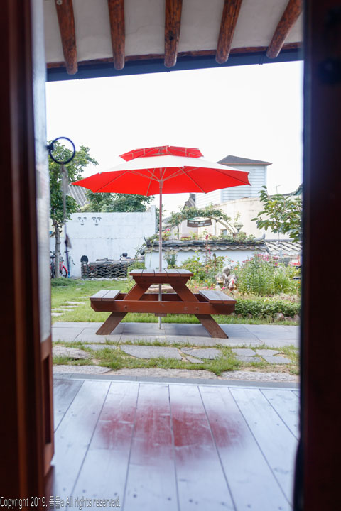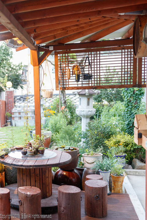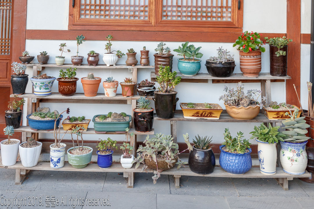 경주한옥민박 라온의 자랑거리 바로 마당에 있는 정원입니다. 정원에는 여러 동상이 설치되어 있고, 각종 다육이 등의 식물이 있어 방안에 가만히 앉아 정원만 봐도 힐링되는 느낌을 받을 수 있는 경주 한옥 게스트하우스입니다