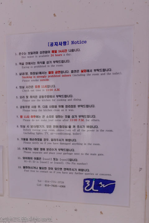 경주 라온민박의 온수는 보일러와 상관없이 24시간 나오고, 퇴실시간은 오전11시이며, LTE무제한요금제를 사용하지 않으시는 분들도 태블릿, 노트북, 스마트폰을 쾌적하게 사용할 수 있는 와이파이까지 설치되어 있습니다.