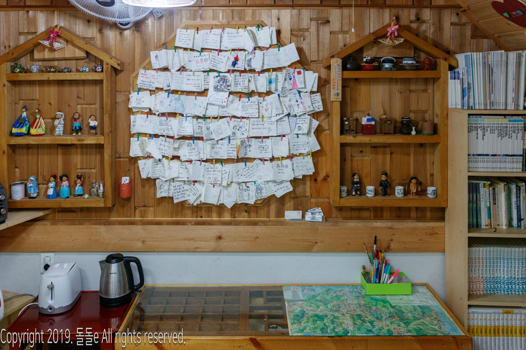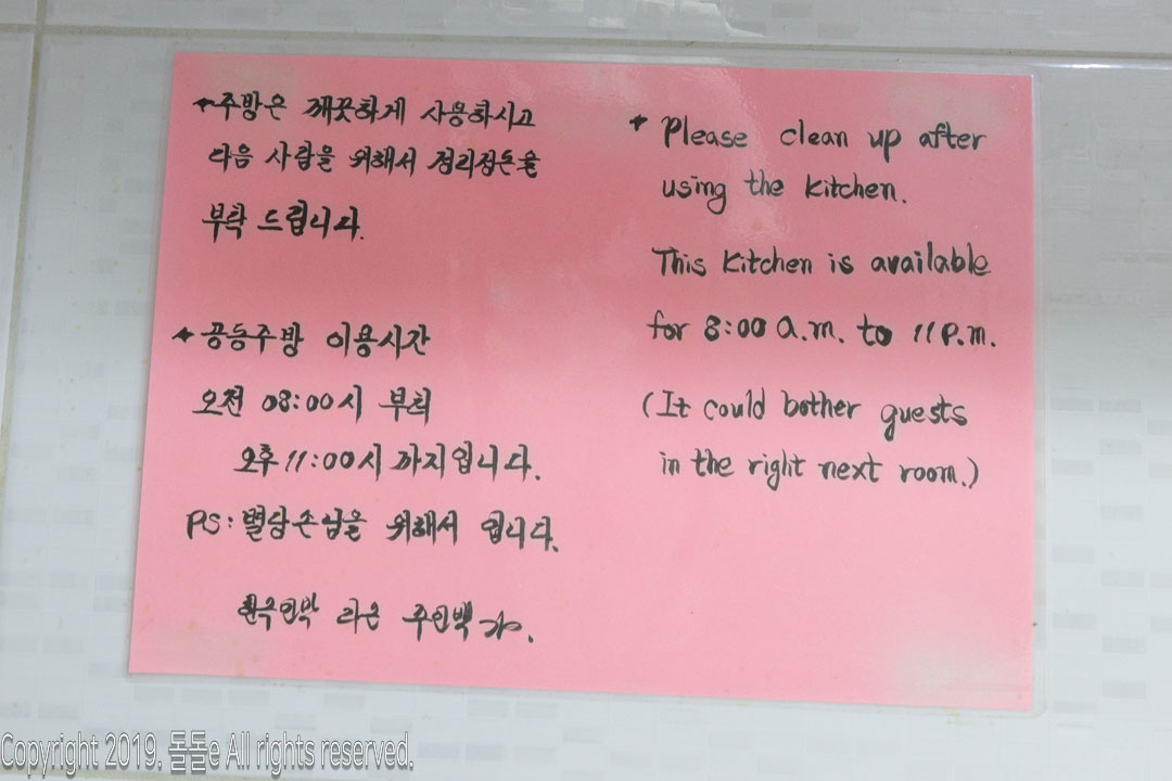 여름휴가를 맞이해 친구 및 가족여행을 온 분들도 편하게 묵을 수 있는 경주한옥민박 라온민박의 주방에는 식탁도 준비되어 있어 토스트, 라면 등을 만들어 먹을 수 있고, 바로 옆에는 필기류가 준비되어 있어 벽에 메모를 남길수도있습니다.