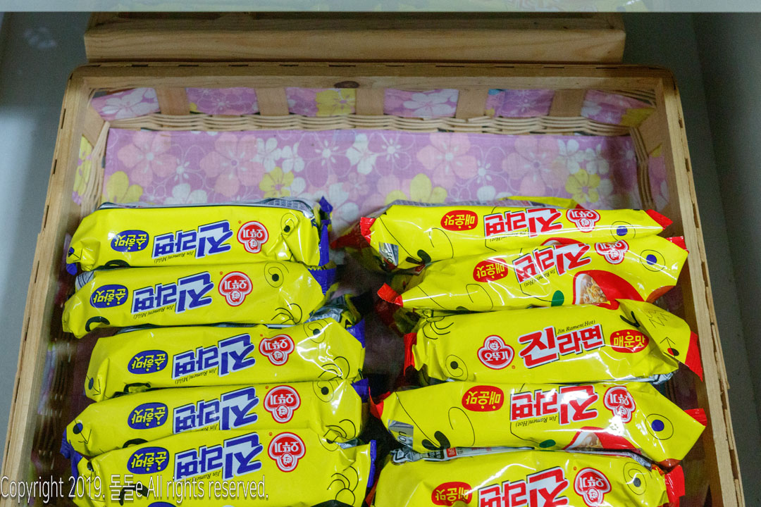 게스트하우스에서 무료로 제공되는 라면이지만 저렴한 저가 라면이 아닌 무려 오뚜기 진라면 매운맛, 순한맛이 제공됩니다.