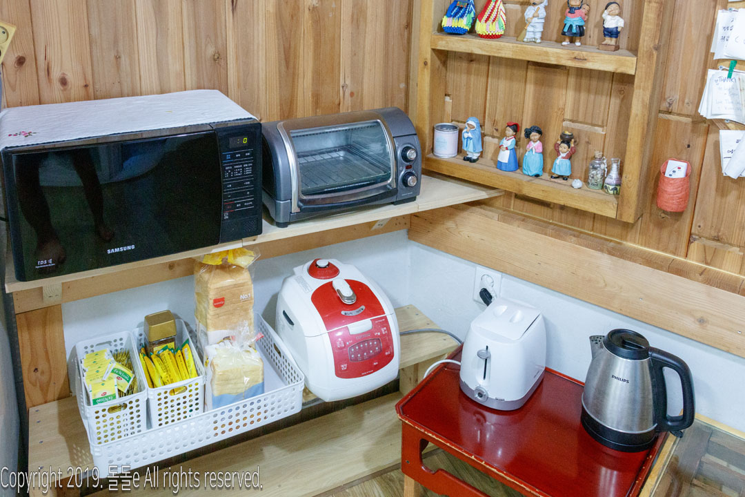 경주 한옥 게스트하우스 라온민박의 주방에는 토스트 빵, 토스트기, 커피포트, 전자레인지, 녹차티백, 인스턴트 커피, 밥, 라면, 매실쨈, 딸기쨈, 딸기유자쨈 등이 준비되어 있고, 이 모든 것을 무료로 이용할 수 있습니다.