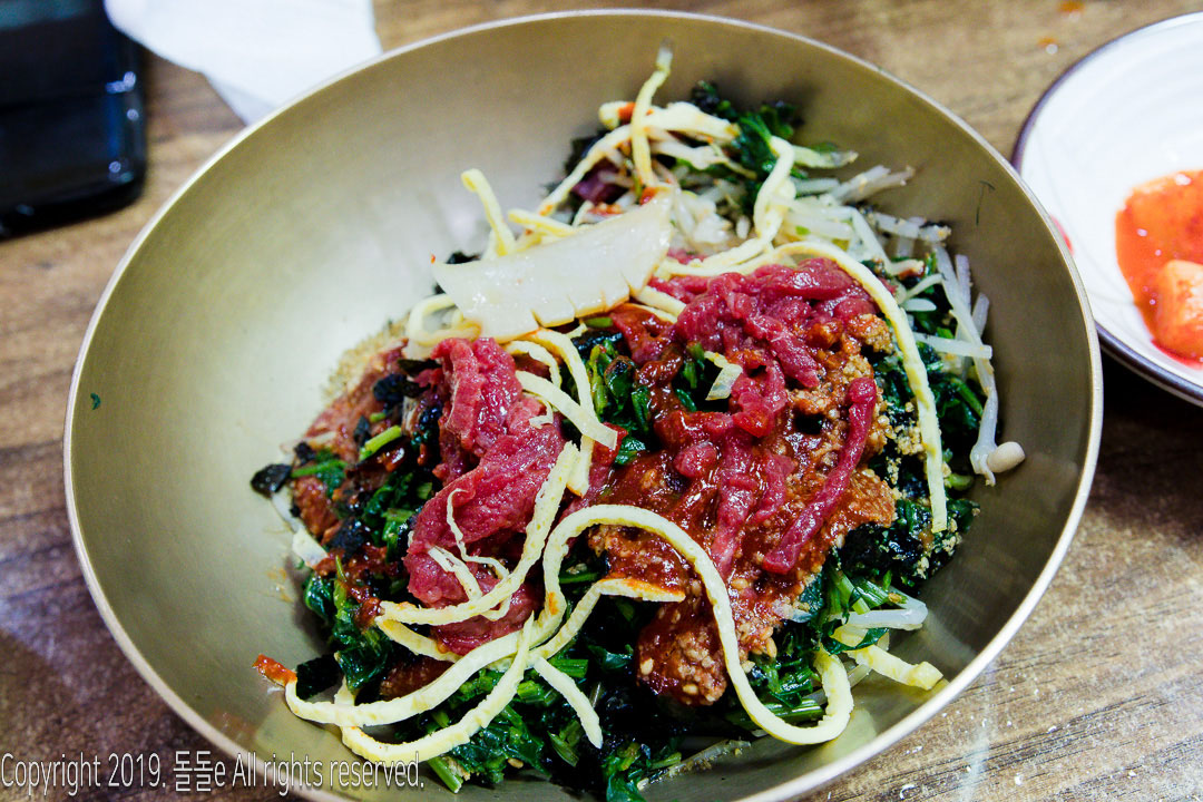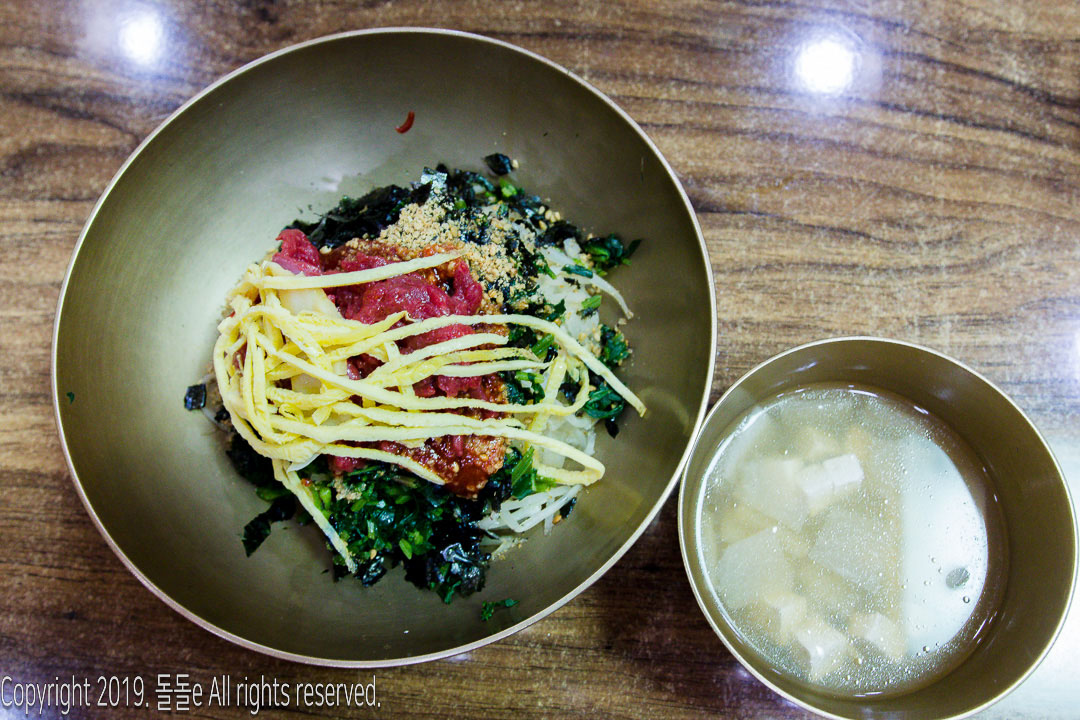 상추, 계란, 오징어, 콩나물 등이 들어간 한우비빔밥은 다른 식당에서처럼 질떨어지는 육회가 아닌 질 좋은 고기를 사용한 육회비빔밥이었는데요. 지금까지 먹어본 육회비빔밥 중 최고였고, 경주함양집 메뉴 한우물회와 달리 간이 강하지 않습니다. 또한 같이 나온 소고기무국 역시 구수한 국물이 일품이었습니다.