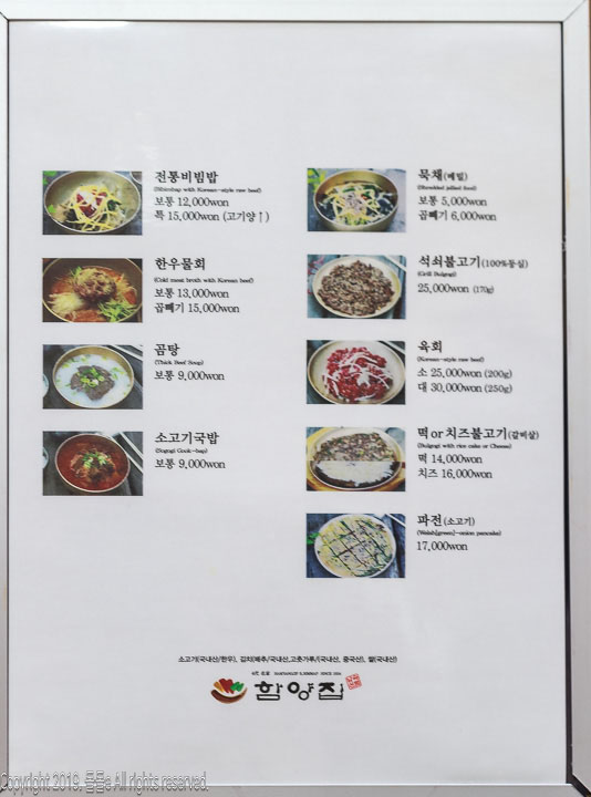 활어회가 들어간 물회 가격도 1만3천원~1만5천원정도하는데, 한우 육회가 들어간 함양집 한우물회 가격은 보통 1만3천원 / 곱빼기 1만5천원, 육회비빔밥 보통 1만2천원 / 곱빼기 1만5천원으로 구성되어 있습니다.