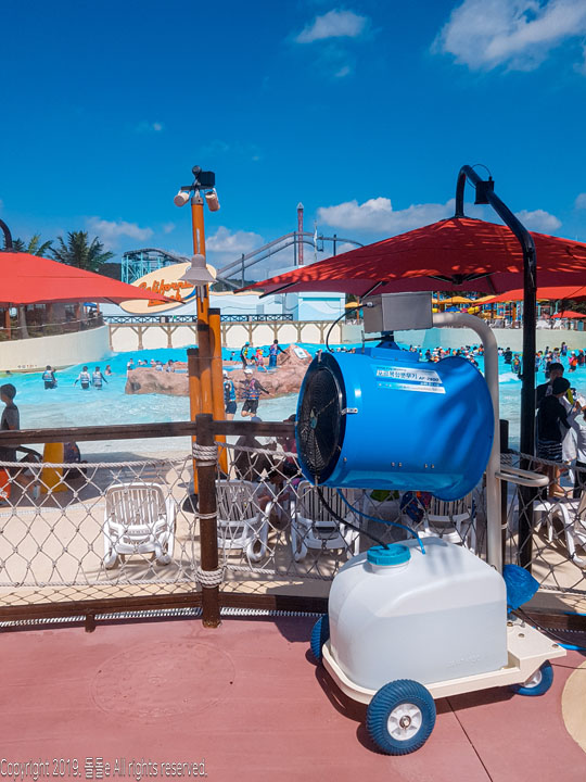 무더운 날씨로 인해 워터파크에서 물놀이를 해도 이동간에 매우 더워서인지 포그복합분무기를 분사해 지나는 이용객들에게 시원함을 제공합니다.