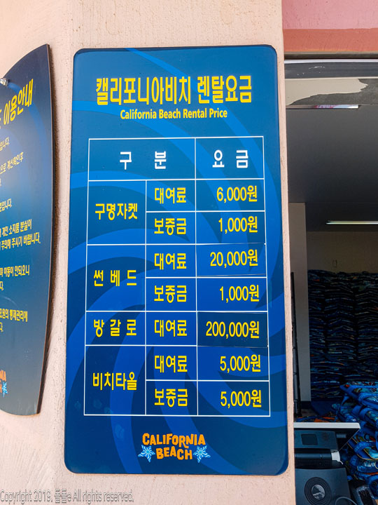 캘리포니아비치 구명조끼 대여료는 6천원, 썬베드 대여료 2만원, 방갈로 20만원, 비치타올 5천원이나, 워터파크 이용 후 샤워실에 일반수건은 무료 사용 가능하며, 오후2시이후부터 썬베드 이용료는 1만원, 방갈로 가격은 15만원으로 할인된 금액으로 이용가능합니다.