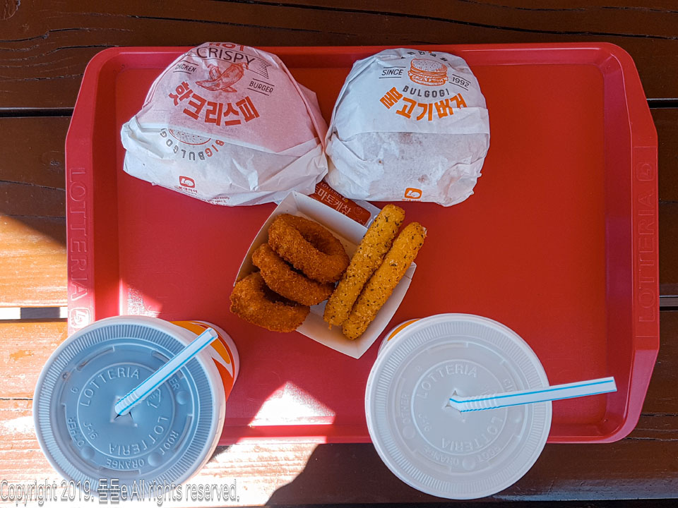캘리포니아비치에서 여러 기구를 이용하고 물놀이를 하고나니 어느 덧 점심시간으로 많은 식사 메뉴가 있었으나 저는 간단하게 롯데리아 햄버거를 먹었습니다.