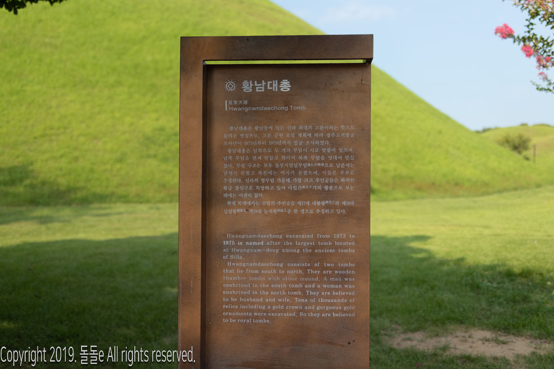 경주 1바2일 코스 경주 황남대총은 황남동에 있는 신라 최대의 고분이라는 뜻으로 붙여진 명칭으로, 고분 공원 조성 계획에 따라 경주고적발굴 조사단이 1973년부터 1975년까지 발굴 조사하였으며, 황남대총은 남북으로 두개의 무덤이 서로 맞붙어 있으며, 남분에는 남자가, 북문에는 여자가 묻혀있으며, 이들은 부부로 추정되고 있습니다.