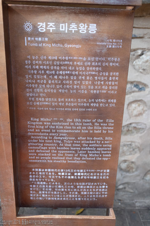 먼저 경주 미추왕릉은 사적 제175호이며, 신라 제13대 미추왕을 모신 곳으로, 미추왕은 경주 김씨의 시조인 김알지의 후예로 신라 최초의 김씨 왕이며 여러 차례 백제의 공격을 막아 내고 농업을 장려한 신라 왕이며, 무덤 전체를 담장으로 둘러 보호하고 있고, 능의 남쪽에는 위패를 모신 숭혜전이 있는데 이 곳에서 매년 후손들이 미추왕의 제향을 받들고 있습니다.