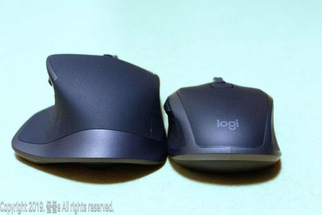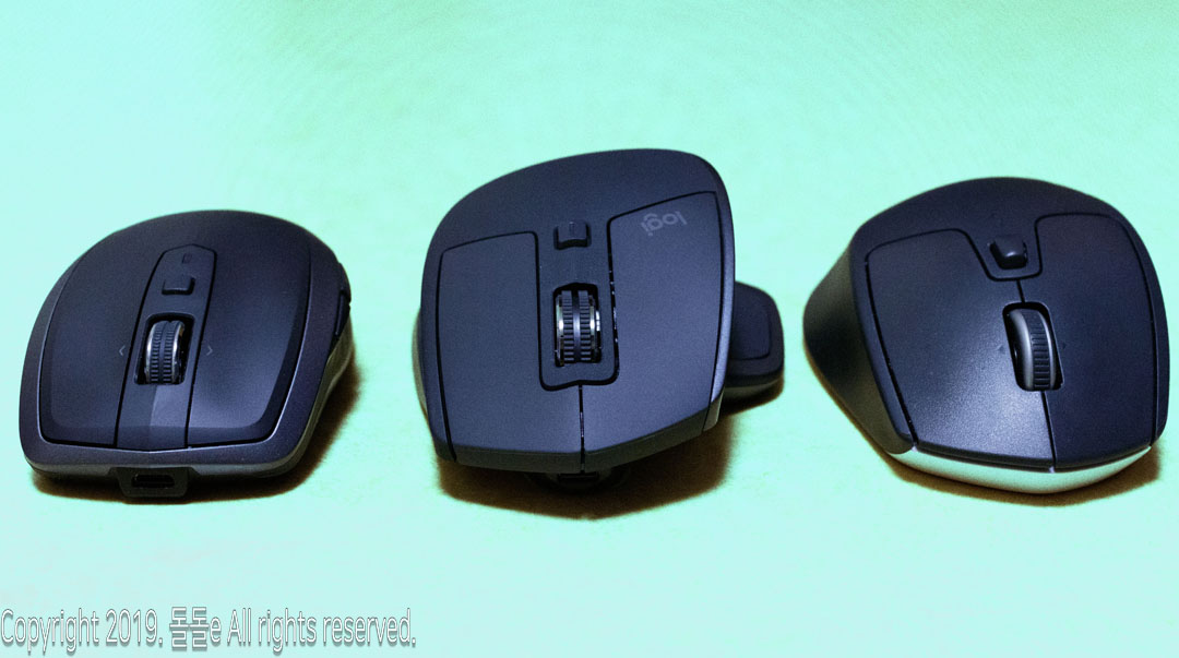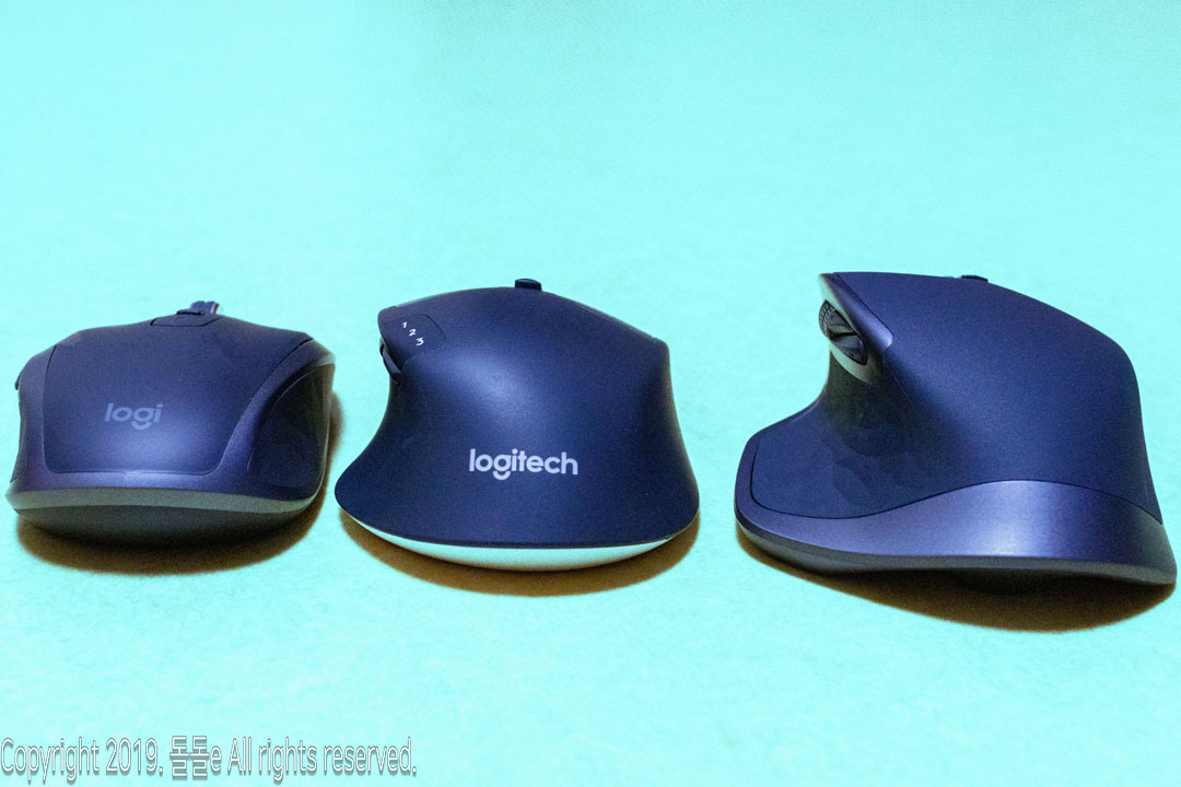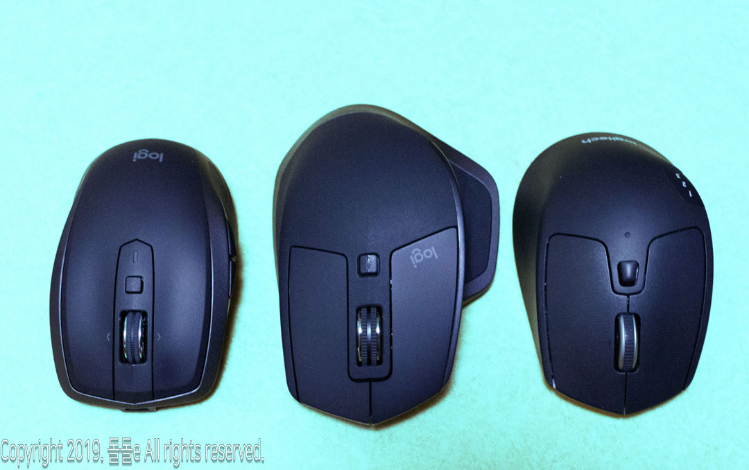 위 사진은 제가 보유하고 있는 로지텍 무한 휠 기능이 있는 프리미엄 마우스 mx anywhere 2s, mx master 2s 그리고 로지텍 m720 이며, 이 세개의 마우스 중 구입 예정이신 분들을 위해 크기 비교를 해보았습니다.