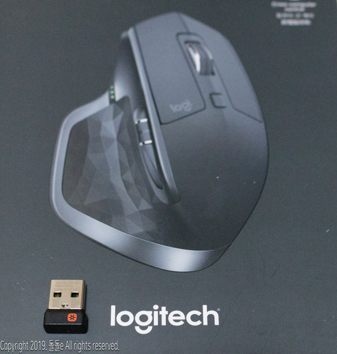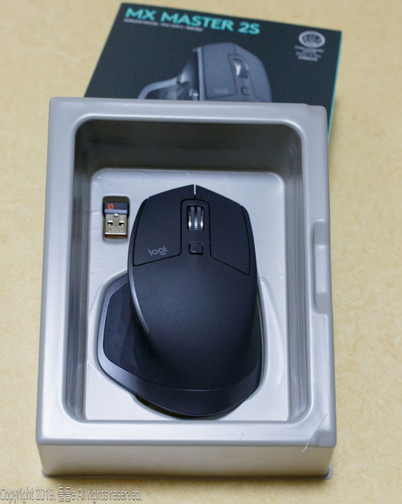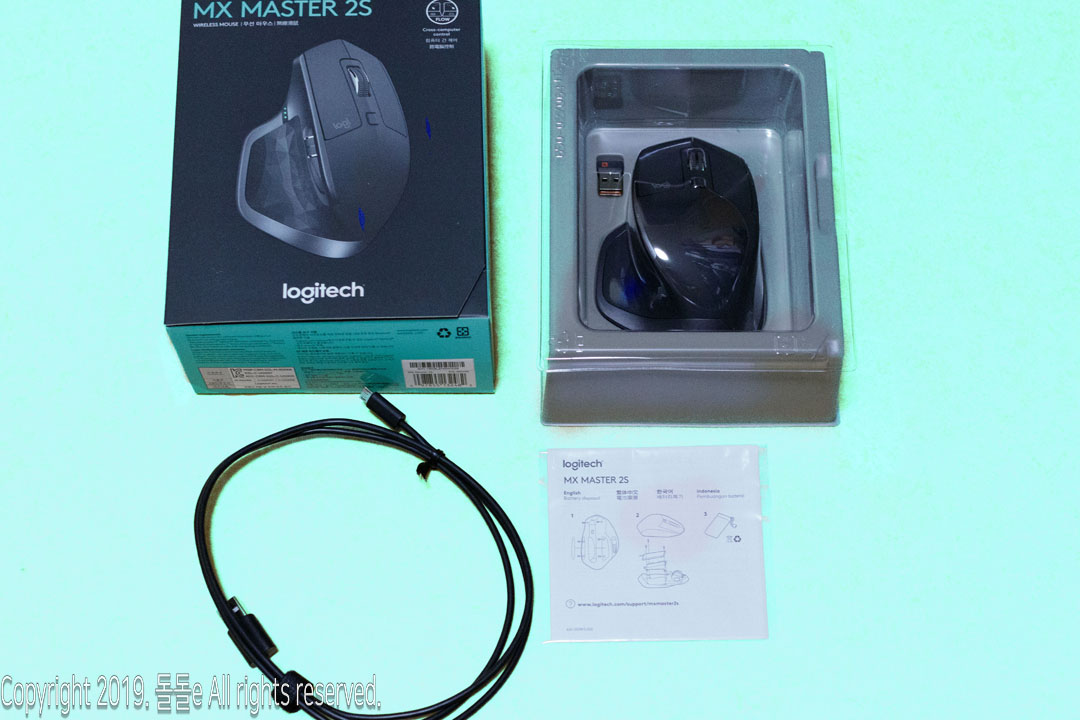 그립감 좋은 마우스 mx master2s는 마우스 충전 케이블, 설명서, 마우스 본체, 로지텍 유니파잉 수신기로 구성되어 있습니다.