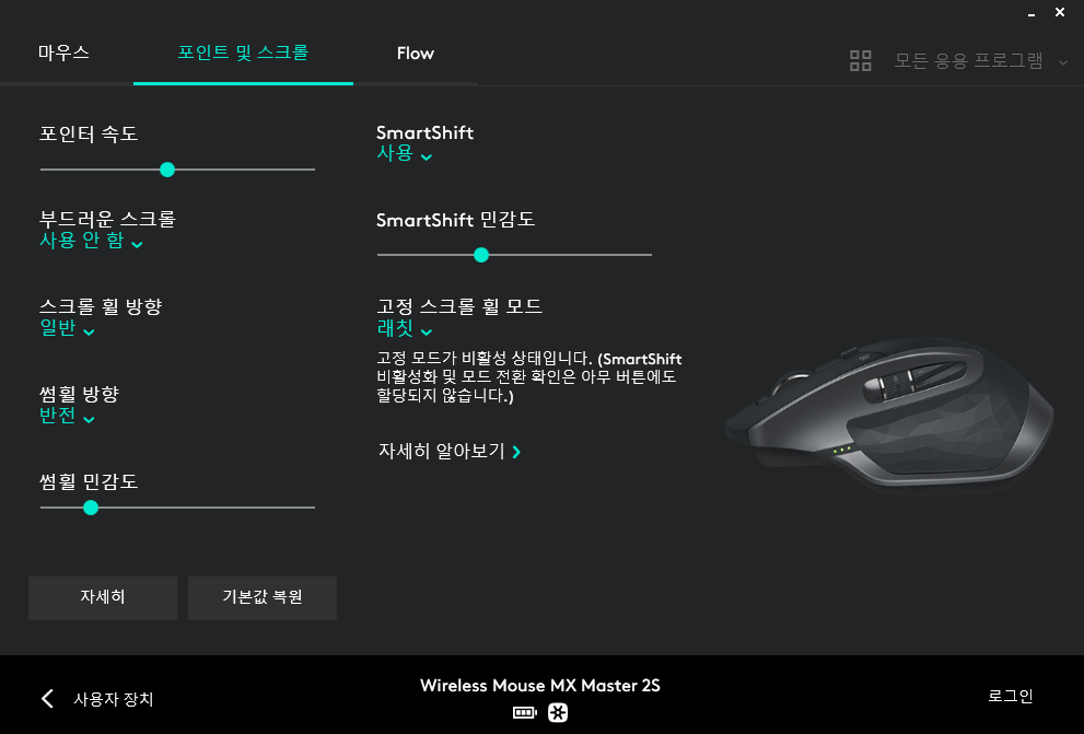 구입 전 로지텍 홈페이지 등을 통해 로지텍 마우스 mx master 2s dpi값 변경을 궁금해 하셨을텐데요. 로지텍 게이밍마우스와 달리 로지텍 옵션 소프트웨어에서 포인터 속도 조절이 가능합니다. 또한 로지텍 무선마우스 MX Master 2S SmartShift 민감도 설정이 가능해서 무한 휠 기능을 어떻게 사용할지 설정이 가능하고, 고정 스크롤 휠 모드는 래칫, 프리스핀 2종이 있으며 래칫으로 설정가능하며, 썸휠 역시 민감도 설정이 가능합니다.