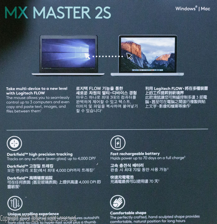 특히 이 무선마우스의 최대 장점을 꼽자면 저가 마우스에는 없는 마우스 무한 휠이라 불리우는 로지텍 초고속 스크롤 휠 기능이 탑재되어 있으며, 더불어 mx anywhere2s와 달리 스크롤 속도를 감지하는 스마트 스크롤 휠 기능이 탑재되어 있기때문에 편하게 무한 휠 기능을 사용 할 수 있고, 우측에 있는 썸휠을 통해 엑셀 문서, 인터넷 검색 등에서 좌우 스크롤까지 모두 가능합니다.