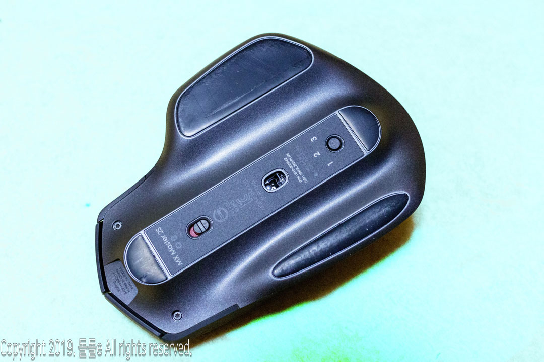 위에서 언급했듯 다크필드 센서 적용이 되어 마우스패드 없이도 유리 등 모든 표면에서 무선 블루투스 마우스 사용이 가능한 제품이고, 다른 pc, 스마트폰, 태블릿으로 연결을 하고자 할 경우 마우스 하부에 있는 1/2/3 버튼으로 기기변경이 가능합니다.