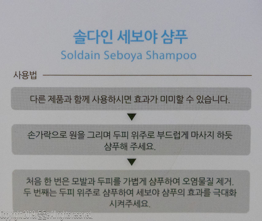비듬에 좋은 샴푸 솔다인세보야샴푸 사용법은 다른제품과 함께 사용시 효과가 미미할 수 있기때문에 제품 하나만 사용하는 것이 좋으며, 손가락으로 원을 그리며 두피 위주로 부드럽게 마사지 하듯 샴푸를 하고 처음 한번은 모발과 두피를 가볍게해 머리에 있는 오염물을 제거 후 두번 두피 위주로 머리를 감습니다.