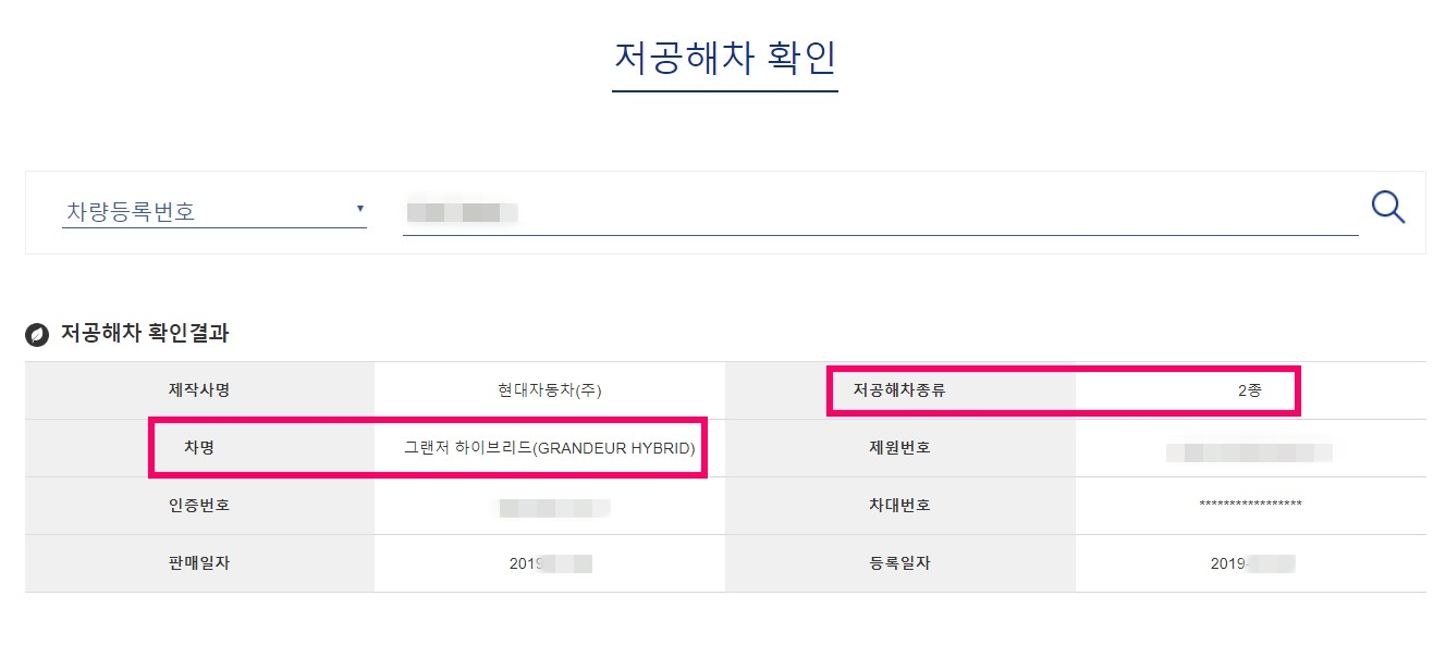저공해차량 조회는 친환경차 종합정보 지원시스템 홈페이지(http://hybridbonus.or.kr/EP020401000SF01.do)에서 확인 가능하며, 차량등록번호 혹은 차대번호를 입력하면 저공해차종류, 판매일자, 등록일자, 자동차명 등 조회 가능하며, 제가 구입한 더뉴그랜저 하이브리드는 저공해차 2종으로 확인됩니다.