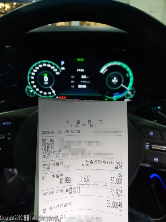 더뉴그랜저 하이브리드 신차 구입 후 108km를 주행 후 앵꼬는 아니었으나 12월 20일 주유량 55.48L, 주유금액 8만4천원 가득 주유를 하니 주행가능거리 970km, 더뉴그랜저 연료탱크 용량은 65L, 주행가능거리에 연료탱크 용량을 나누어보니 14.92km/L의 연비가 나옵니다.