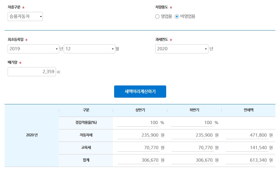 자동차세 계산은 배기량 기준 이며, 1000cc 이하 cc당 80원, 1600cc 이하 cc당 140원, 1600cc 초과 cc당 200원 이며, 영업용(택시 등)은 cc당 세액 18원부터 24원입니다.