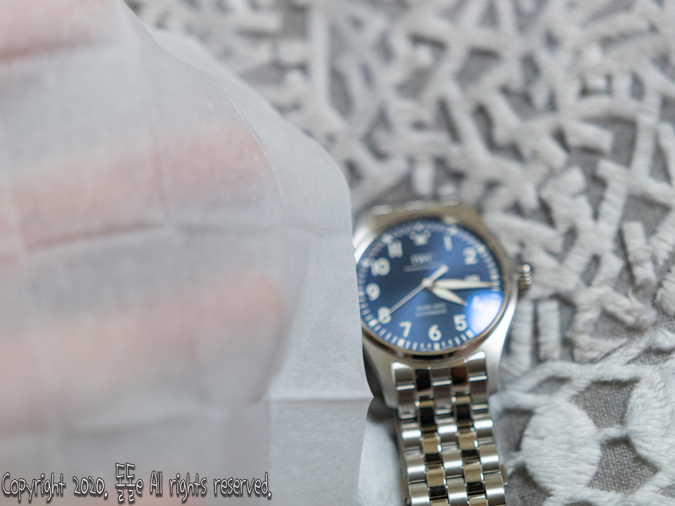 보호필름 부착 전 구입할때 그리고 집에와서 부모님 보여드릴때 빼고는 착용하지 않고 소중히 간직하고 있는 제 명품 예물시계 iwc파일럿시계 마크18 어린왕자 에디션이지만, 보다 깔끔하게 보호필름을 부착하기 위해 알콜 천으로 기스 나지 않게 살살 먼지를 닦아 줍니다.