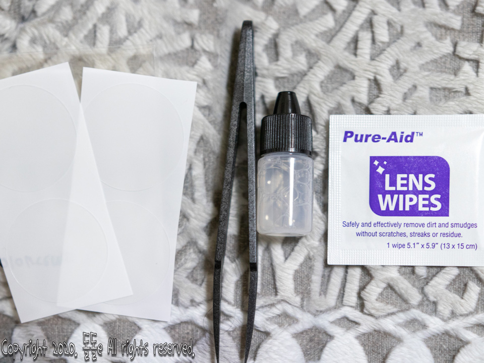 먼지를 깨끗하게 제거 후 동봉되어 있는 부착 액을 2~3방울 떨어뜨리면 된다고 부착 동영상에 나왔으나 저는 일단 많이 이 떨어뜨렸습니다.