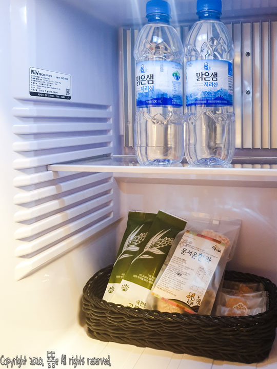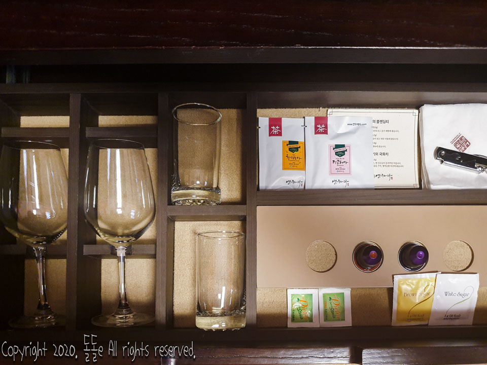 냉장고를 열면 생수2명, 미니약과, 곡물바 강정, 한과가 기본 제공되며, 옆에 수납장을 열면 블랜딩 꽃차 티백, 와인잔, 유리컵, 네스프레소커피캡슐 2개가 제공되기때문에 별거 아니지만 큰 만족감을 받을 수 있습니다.
