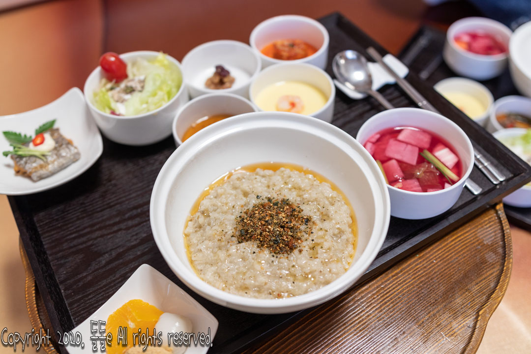 마지막으로 남원 호텔 추천하는 한옥호텔 남원예촌 조식 메뉴는 전복죽, 우거지 해장국, 황태 해장국, 소고기 미역국 중 선택 가능하며, 저는 전복죽을 먹었으며, 동치미, 계란찜, 장조림, 떡, 과일, 갈치, 견과류 등 다양하고 많은 밑반찬을 직원이 룸으로 가져다 주는데, 생각보다 너무 잘나와 놀랬습니다.
