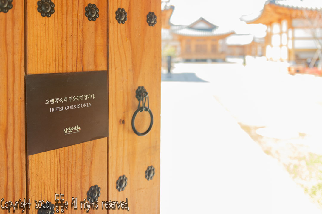 2018 한국관광의 별, 2018 전북 건축문화상 대상, 2020 서비스만족대상을 수상한 남원 한옥 호텔 이며, 남원예촌 프론트는 호텔 입구 바로 옆에 있는 한옥건물 '도움마루'이고, 조식을 먹는 곳은 프론트 옆에 있는 '사랑마루' 입니다.