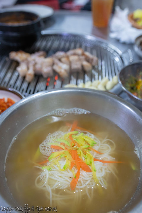 평소 특유의 삼겹살 느끼함으로 삼겹살을 좋아하지 않는 나이지만, 군산 고깃집의 삼겹살은 풍부한 육즙과 딱 좋은 고기 두께로 뛰어난 식감 그리고 지금까지 먹어보지 못한 느끼하지 않고 잡 냄새 하나 없는 놀라운 맛으로 '2인분만 먹고 가자'라는 입장 전 생각은 뒤로 한채 1인분을 더 주문하고 잔치국수까지 주문해서 먹었다.