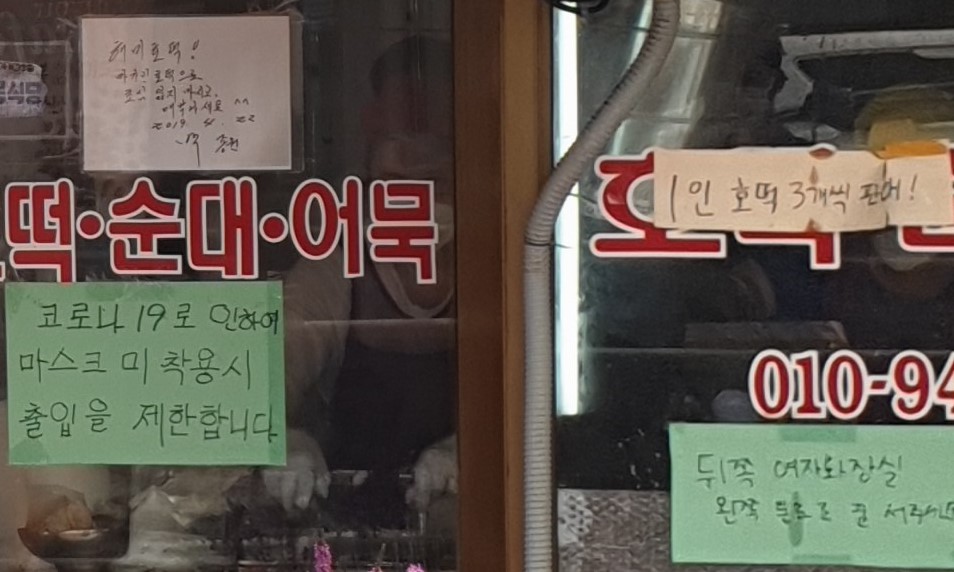 사회적거리두기 캠페인에 동참 중인 백종원 골목식당 호떡은 마스크 미착용시 출입을 제한한다는 안내문이 적혀있습니다.