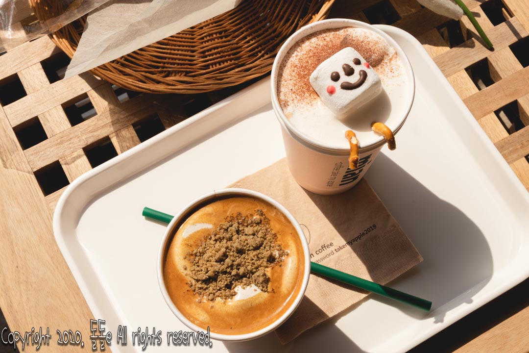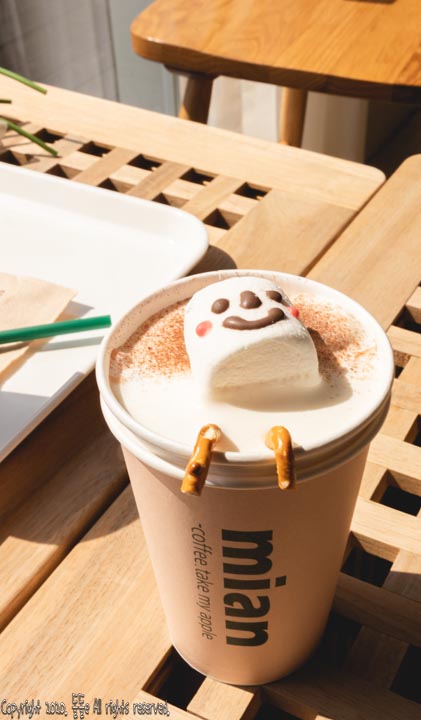 마시멜로우와 과자 프레첼을 이용해 종이컵에서 샤워를 하는 듯한 캐릭터를 표현했는데 너무 귀여워서 먹어야하나 말아야하나 잠깐의 고민을 하게 만든 메뉴였습니다.
