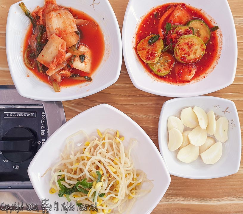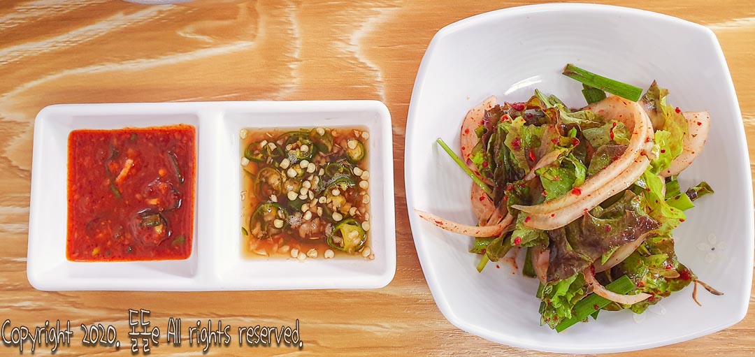 백종원 레시피로 만든 양념장과 매콤은 한데 전혀 맵지 않은 소스 총 두종류, 콩나물, 오이무침, 김치 등 여러 종류의 밑 반찬이 제공됩니다.