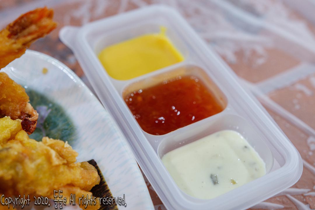 튀김에 찍어 먹으면 더 맛있게 먹을 수 있다는 말에 구입한 소스는 1천원이고, 머스타드, 칠리 외 1종 총 3종류의 소스이다.
