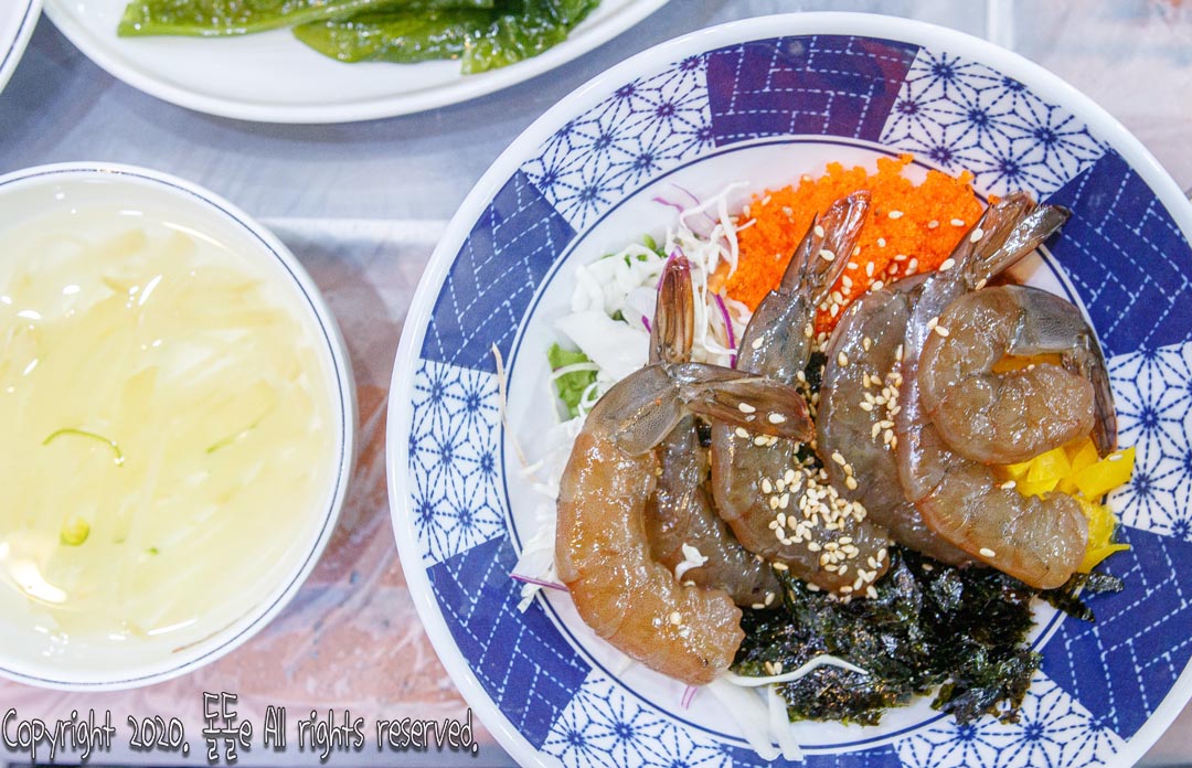 태안 맛집의 대표메뉴는 대하장덮밥, 대한조개스페샬3인(조개,전복회,만세튀김,칼국수)으로, 평소 먹어보지 못한 대하장덮밥을 2인분 주문 후 먹었다.