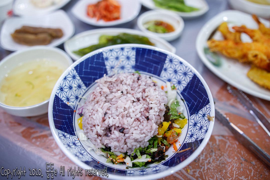 참고로 대한횟집 만세튀김 대하장덮밥 가격은 1인분 1만2천원으로 한끼 식사 가격으로는 다소 부담될 수 있는 금액이나 대하가 많이 들어 있고 반찬도 많기에 수긍할만하다.