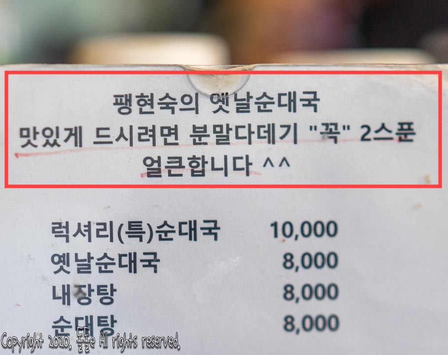 팽현숙 순대국 가격은 8천원, 럭셔리(특)순대국 1만원, 순대접시 1만5천원 등의 합리적인 가격으로 판매하고 있으며, 순대국맛있는게방법으로는 분말다데기 2스푼을 넣어 먹으면 얼큰하고 맛있게 먹을 수 있다는데 저는 넣지 않고 먹었습니다.
