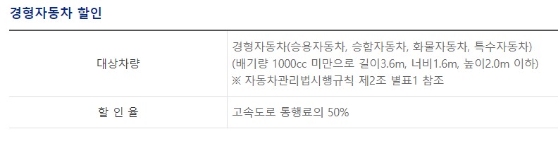 단, 레이, 모닝, 스파크 등 경차는 주말 고속도로 통행료 할증 역시 50% 할인 적용 가능합니다.