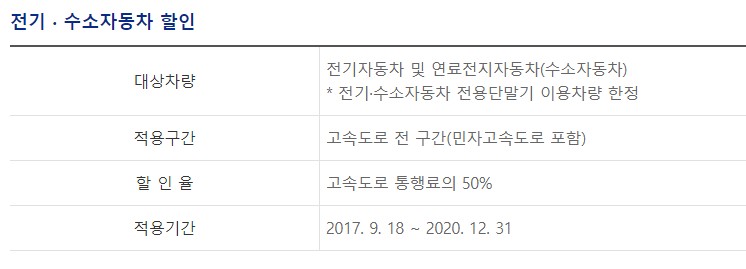 코나 일렉트릭, 니로ev, 아이오닉 일렉트릭, 포터 전기차, 쏘울ev, 넥쏘, sm3 ze 등 여러 전기자동차, 수소자동차는 고속도로 통행료 50% 할인 가능합니다.
