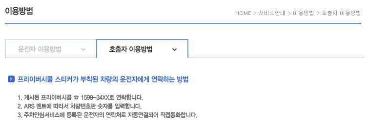 프라이버시콜 사용방법은 차량에 부착된 주차번호판에 적혀 있는 1599-XXXX에 연락 후 차량 번호를 입력하면 자동으로 차주에게 연락이 갑니다.