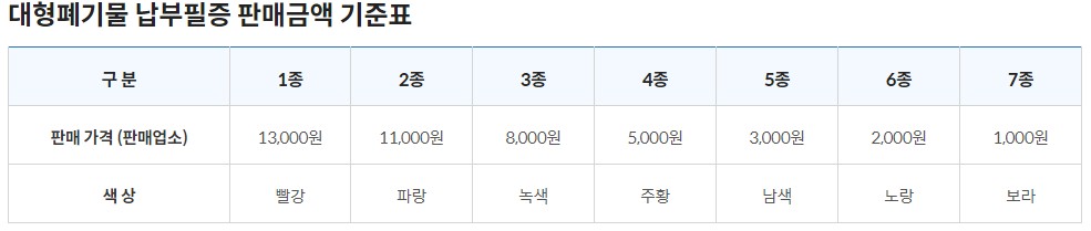 안산시 폐기물스티커가격은 1종 ~ 7종 규격에 따라 13,000원부터 1,000원으로 구성되어 있습니다.