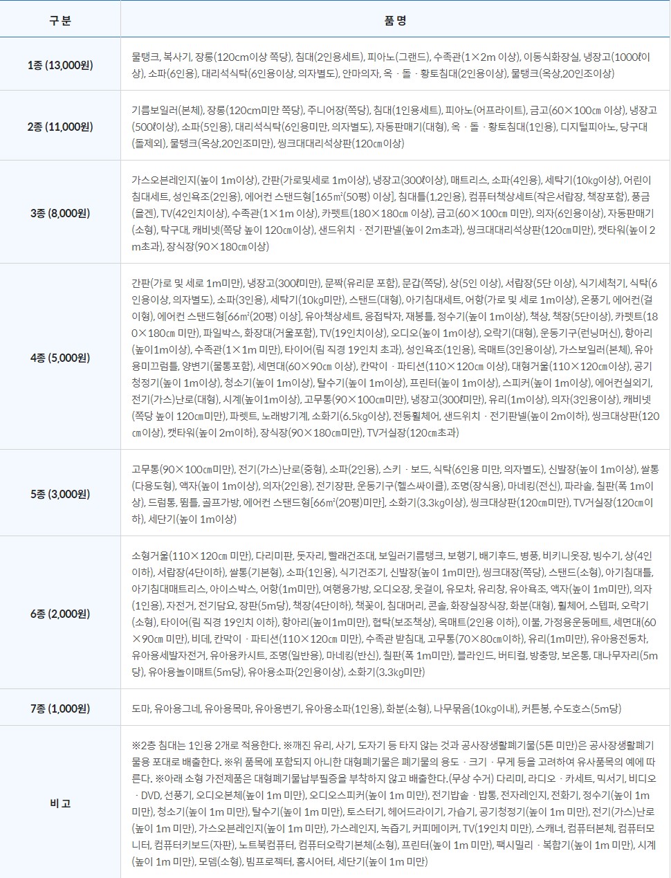 대표적으로 가정에서 많이 발생하는 가구 폐기물 중 6인용 식탁, 소파, 수족관, 2인용 침대 1만3천원, 1인용침대, 5인용쇼파, 씽크대대리석상판 1만1천원, 가스레인지, 매트리스, 4인용쇼파, 컴퓨터 책상, 장식장 8천원 등으로 구성되어 있습니다.