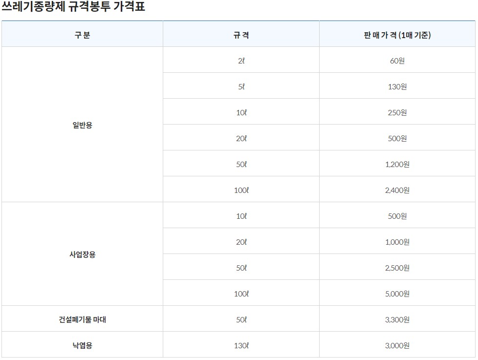- 종량제쓰레기봉투 가격표